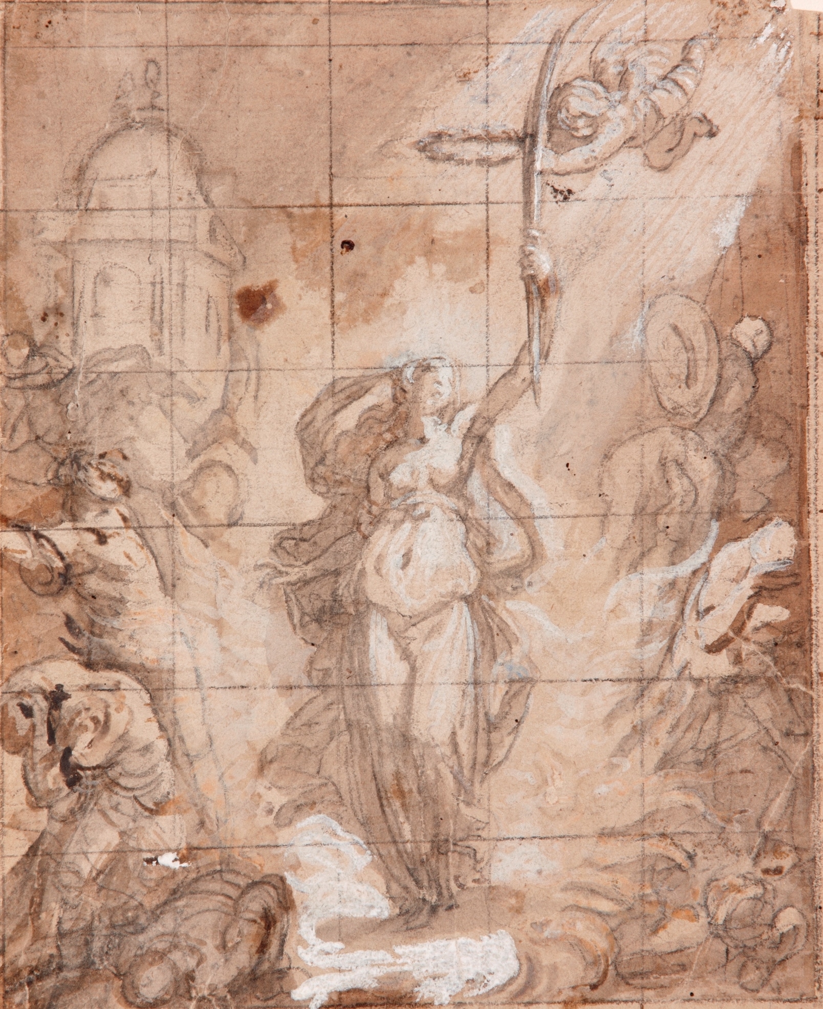 From a technical viewpoint, the drawing can be firmly attributed to Vicente Carducho. The rapid line with which the figures are created, the sepia washes and highly characteristic manner of applying the white lead with very thick brushstrokes are all unmistakable. The drawing need only be compared with others by the artist such as Saint Gregory the Great (Madrid, Museo Nacional del Prado, inv. D-83), or the Communion of a Nun Saint (Madrid, Museo Nacional del Prado, inv. D-91), which are clearly by the same hand. The dazzling apparition of the saint can also be compared with Saint Bruno appearing to Rogerio Guiscardo, Duke of Calabria (Madrid, Biblioteca Nacional, inv. Dib/16/35/3), which is conceived in a notably similar manner through the use of powerful strokes of white lead. 3 The airy female figure, be it Saint Barbara, Victory, or Peace, can be seen in other compositions by Carducho such as the illustration to the Fifth Dialogue in his Diálogos de la Pintura (Madrid, 1633). 4 The stylised nature of that figure, with her rounded stomach, vaporous clothing and ribbons that tie up her hair and whirl around her in the wind are elements found in both depictions.