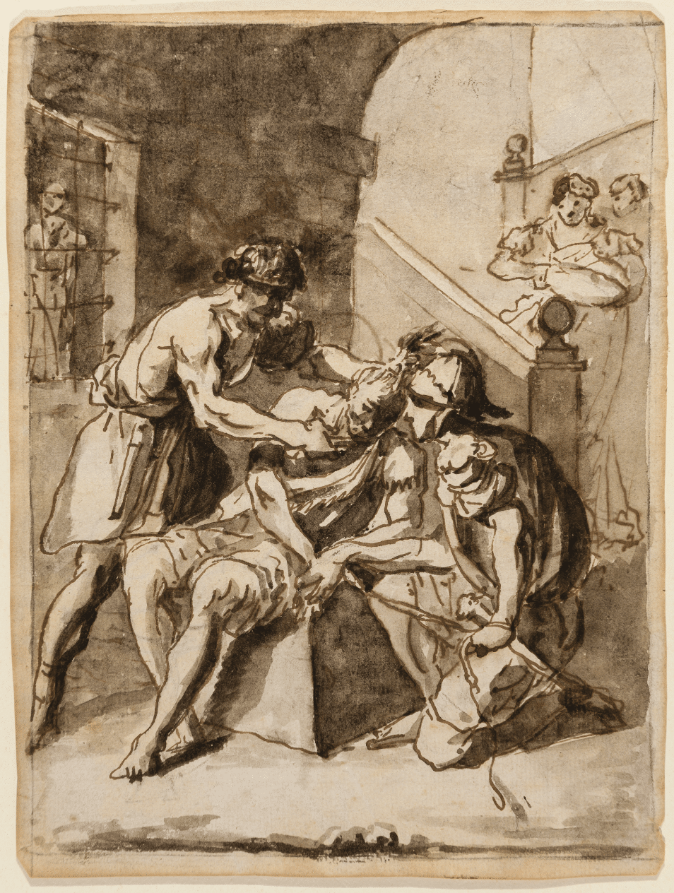 González Velázquez’s series of preparatory drawings for etchings are striking for their technical freedom, which is uncommon in designs for prints as these normally emphasise straight lines for the figures and parallel ones for the shading in order to facilitate their transfer to the copperplate. However, in his drawings for the Saints of the Days González Velázquez produced designs that reveal both his capacity for narrative invention and his unique technique, combining grey-brown ink applied in sinuous lines with wash, the latter used to enliven the shadows and model the figures. While these drawings are inspired by the Flos Sanctorum it was the artist himself who chose which saint would be used for each day (given that each date has more than one saint) and also which episode from that saint’s life would be depicted as many of them had extremely complex legends. This is the case, for example, with the present saint, Hippolytus. There are in fact various saints of that name and the feast day of the one depicted by González Velázquez is 13 August. The Flos Sanctorum recounts that Hippolytus was a Roman jailer who guarded Saint Lawrence. 4 Having been converted to Christianity by that saint when he witnessed his miracles, Hippolytus was entrusted with burying him after his martyrdom. When the Emperor heard of this he had Hippolytus arrested, beaten on the mouth with a stone and stripped of his white robes of a newly baptised Christian with the aim of forcing him to renounce his faith. When physical punishment failed to achieve this, the Emperor confiscated all Hippolytus’s possessions and seized his family who were also recent converts. Among them was Concordia, who had been Hippolytus’s wet nurse. She defended him and was whipped to death, thus also attaining martyr status. All other family members had their throats cut in the presence of Hippolytus, who was finally tied to wild horses’ tails, dragged along by them and torn apart. The saint’s complex martyrdom is brilliantly narrated by González Velázquez who identifies Hippolytus by setting the scene in a prison and by referring to his habitual employment through the presence of prison bars in the middle ground on the left. On the right, the woman holding a baby and descending the stairs is Hippolytus’s wet nurse Concordia whose martyrdom is so closely connected with his. The saint himself is present in the foreground sitting on a large stone block while one of his torturers holds him by the hair, a gesture also used in the artist’s preparatory drawing for the print of Saint Julian (fig. 1) in which that saint is held by the hair before being decapitated. González Velázquez also includes the detail of a torturer bringing an object close to Hippolytus’s mouth, which is undoubtedly the stone used to strike his teeth. A second torturer kneels on the right, restraining him with ropes. The window with bars and the three figures create a compositional diagonal that allows each element in the scene to be read in succession with the right-hand torturer leading the viewer’s eye towards the wet nurse in the middle ground, thus introducing a different iconographic episode.