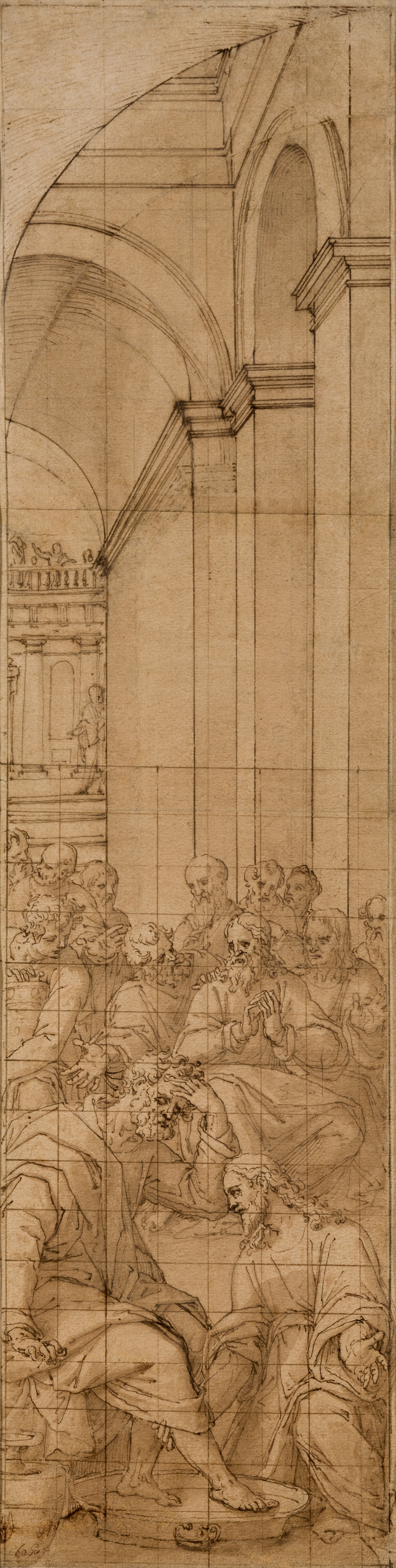 The present drawing is the final study for one of the doors of the reliquary altar described by Ponz. The triptych is dedicated to The legal Supper of the Lamb and remains today in its original location for which it was created (Patrimonio Nacional, inv. no. 10014871). With the doors closed it shows The Paschal Supper, which is the precise moment when Christ, surrounded by the standing Apostles, blesses the food, as stipulated in the holy texts. The open triptych has a central scene of The Institution of the Eucharist, Christ’s Entry into Jerusalem on the left and Christ washing the Disciples’ Feet on the right. It is this episode, recounted in John 13:1-20, that Cincinato translated from paper to panel with only a few slight variations. The present sheet is a precise and highly finished final drawing that is squared up for use on the intended support of the finished work. It was initially executed in pencil then reworked by the artist in pen and grey-brown ink with delicate washes of the same tone through which Cincinato creates the volumes and shadows. The grandeur of the fully classical architectural setting is perfectly conveyed and creates a greater sense of depth and perspective in the drawing. Cincinato was aware of his skills in this field and transformed the architecture and setting into one of the key elements in his composition in a way never previously seen in Spain. 8 Located in the foreground is Peter, who with an expression of compunction seems to be addressing Christ and saying “Lord, dost thou wash my feet”, as in John’s account (13:6). Christ is depicted kneeling before Peter and supporting the calf of his lower leg, which the Apostle has just lifted out of a basin. Behind them are the other Apostles, who form an animated group in which the gazes and gestures direct the viewer’s attention from one to another. There are almost no changes or significant variations between the figures in the drawing and those in the final panel although some beardless ones acquire beards. The most notable changes are to the setting: whereas the background of the drawing includes a flight of steps and some distant figures, this element is completely removed in the oil and replaced by a blind wall. In addition, the right side of the architectural setting in the drawing has an arched opening in the wall whereas in the final panel this becomes a low door with a relief above it. Overall however, the principal difference between the oil and this preparatory study is the loss of freshness and the rigidity of the final painting in comparison with the present drawing.