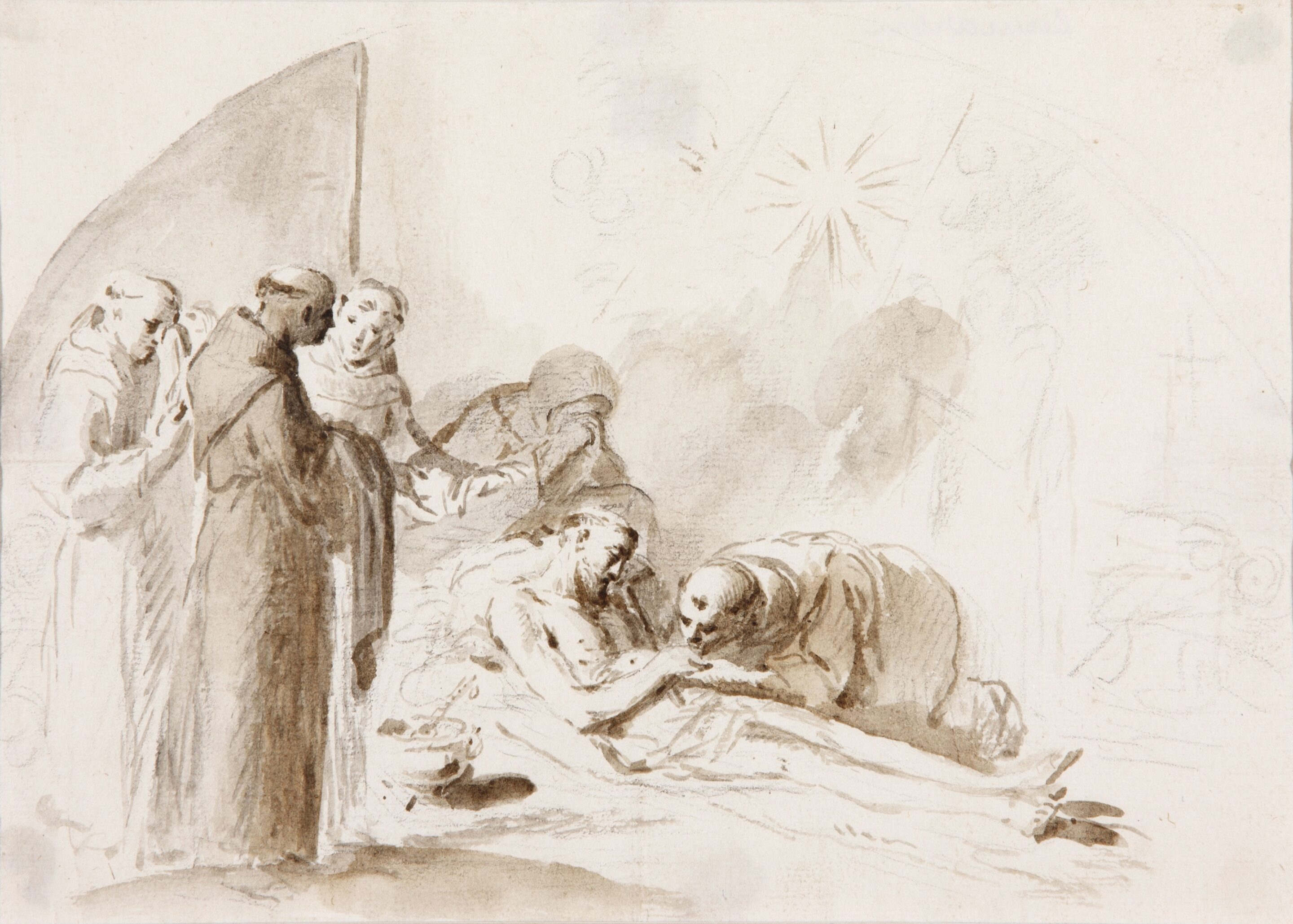 The actual drawing depicts the Death of Saint Francis, and is a preliminary sketch for one of the six oil paintings commissioned to Camarón by the Real Patronato de San Francisco el Grande around 1786, for the cloister of said convent. Together with this theme he also depicted: Saint Francis comforted by the angels, Saint Francis and the poor, Saint Francis, with a child in arms, in front of three women, The conversion of the wolf of Gubbio and The stigmatization of Saint Francis (all of them owned by the Prado Museum and deposited in the church of San Francisco el Grande). This work is linked with another drawing that is shown in this exhibition, the design of Zacarías González Velázquez Saint Francis giving his cape to a poor person, preparatory also for another painting of the series San Francisco for the said church of Madrid.