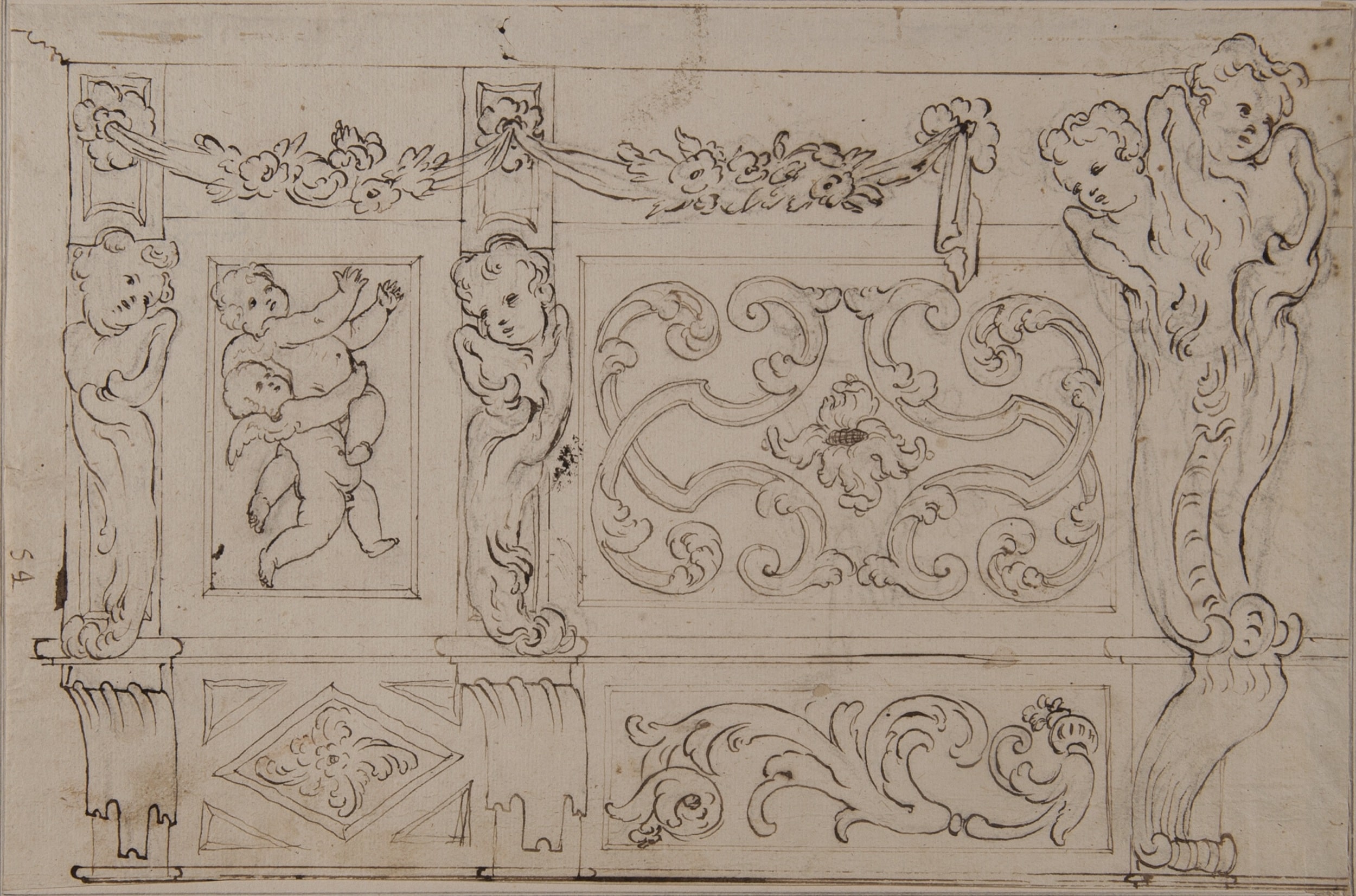 Comparable heads of small angels with rocaille bodies are to be seen in the present drawing. They also appear in other drawings by Tomé including the Project for the Altarpiece in the Chapel of San Ildefonso in Toledo Cathedral (Madrid, Biblioteca Nacional, inv. no. DIB/18/1/7196) and one for an Altarpiece of Saint Benedict (Madrid, Biblioteca Nacional, inv. no. DIB/14/45/75).