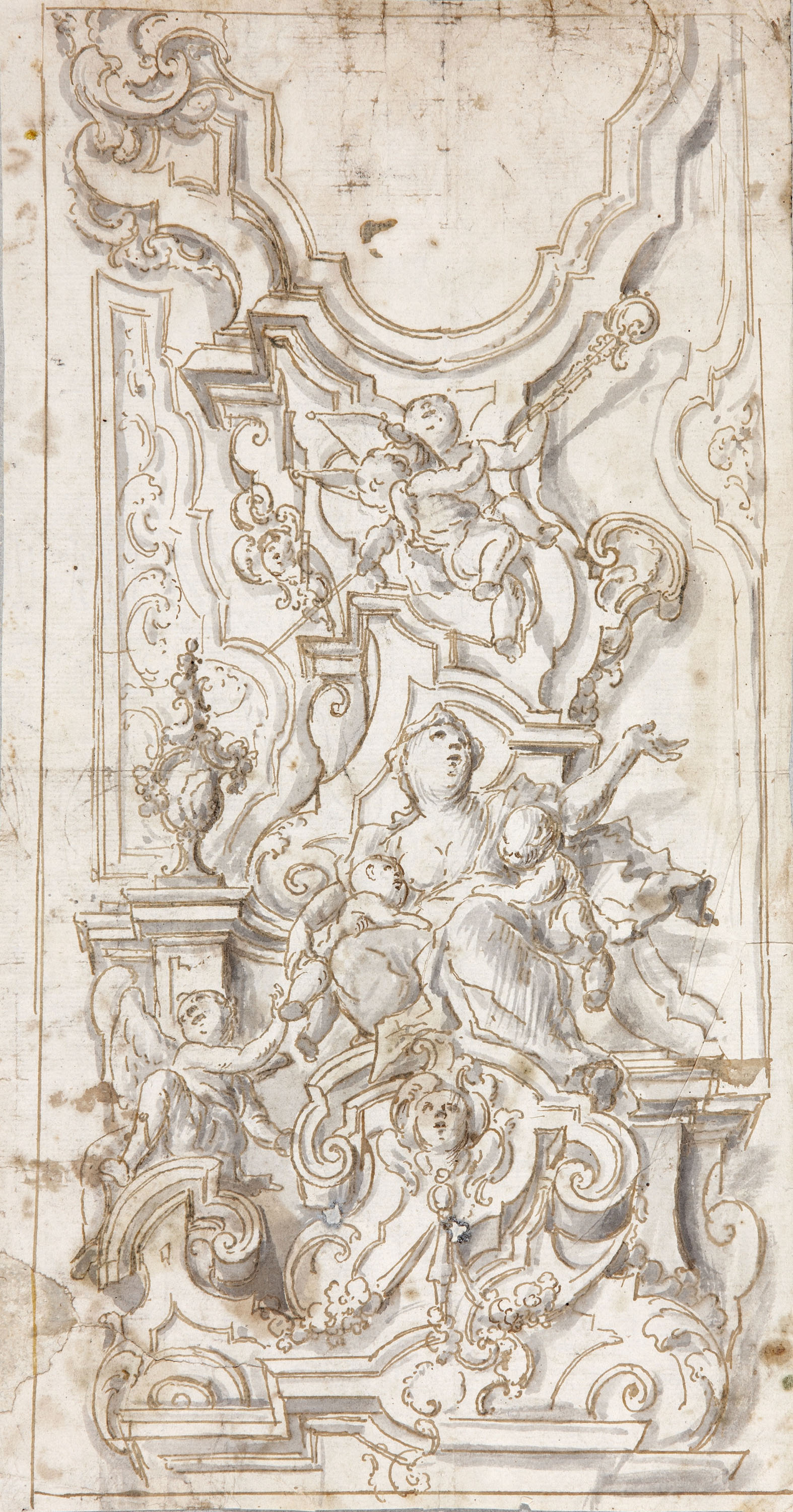 The present drawing is an extremely good example of the above-mentioned stylistic characteristics and may be a design for one of Martínez’s mural decorations. It depicts an Allegory of Charity, depicted in black chalk and grey-brown wash6. Charity is one of the Three Theological Virtues, along with Faith and Hope, and is thus a common motif in church iconography. The typically Baroque composition has the allegorical figure as its central axis as well as a series of rising, decorative elements such as small angels, garlands, flower vases, plinths and cartouches that together create a sense of profuse, undulating decoration. The pyramidal composition terminates with a lobed cornice that imitates rocaille decoration as found in gesso work and in Andalusian Baroque altarpieces. A decorative framework of this type, of which only half is depicted (on the assumption that the other, symmetrical half would have been identical), would have been designed to house a religious scene or figure. This type of decorative design is notably comparable to that found in other works by the artist such as the sanctuary of the Hospital de la Misericordia in Seville. There, angels depicted in bold foreshortening are set in lobed frames. Another comparable decorative scheme is that in the church of Saint Louis of the French, in which trompe l’oeil architectural structures and gesso work are combined with garlands, angels, etc.