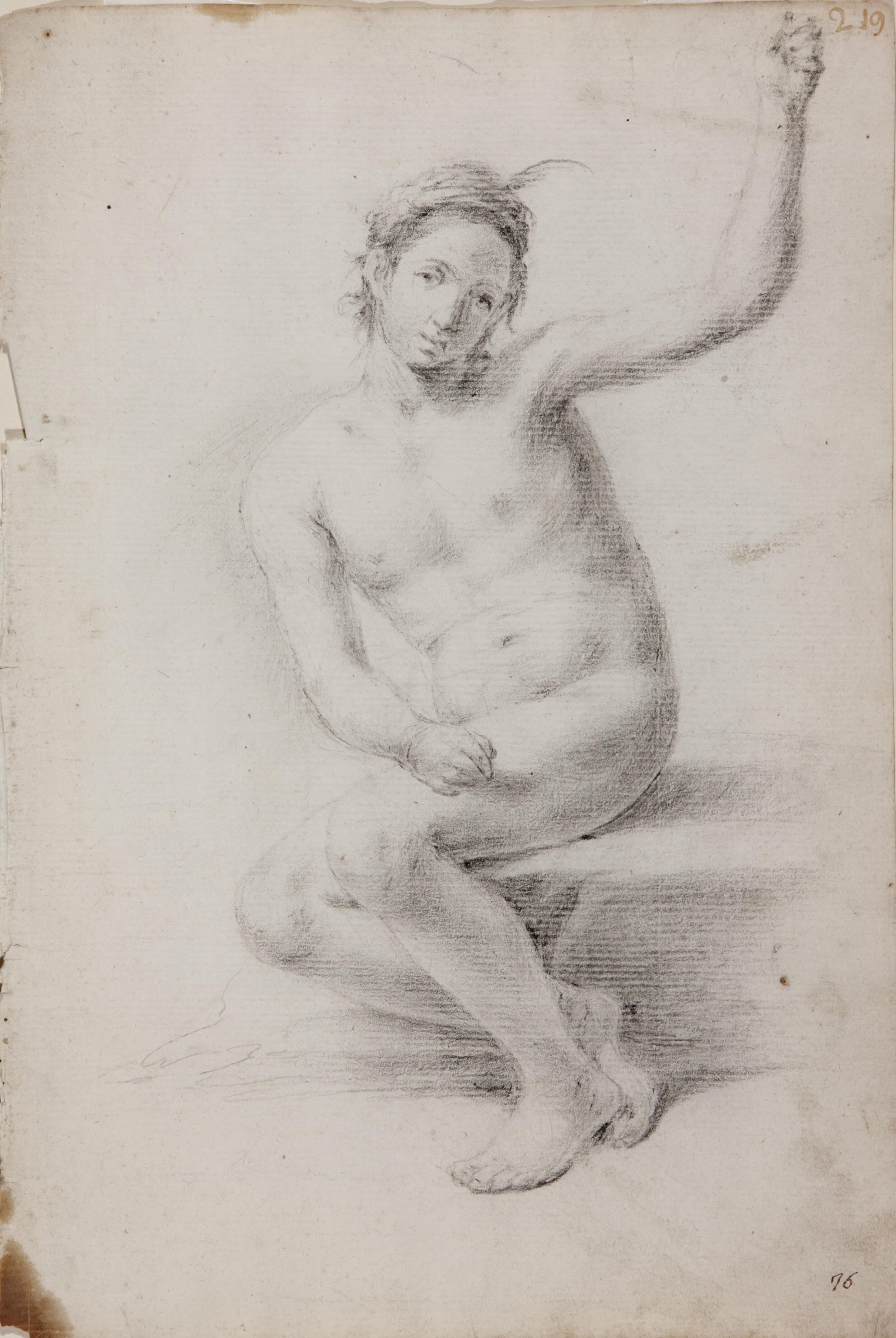The present academic study was in the Brauer Collection. 6 It depicts a youth seated on a step with his arms raised in an unnatural pose. To maintain poses of this type for hours the models would hold on to ropes or structures that allowed them to remain still. Such practice follows the advice of José García Hidalgo, whose treatise Principios para estudiar el nobilísimo arte de la pintura (Madrid, 1693) includes a print of a posing model comparable to the present drawing, surrounded in the case of the print by students drawing the figure from different angles and viewpoints, advised by the master.