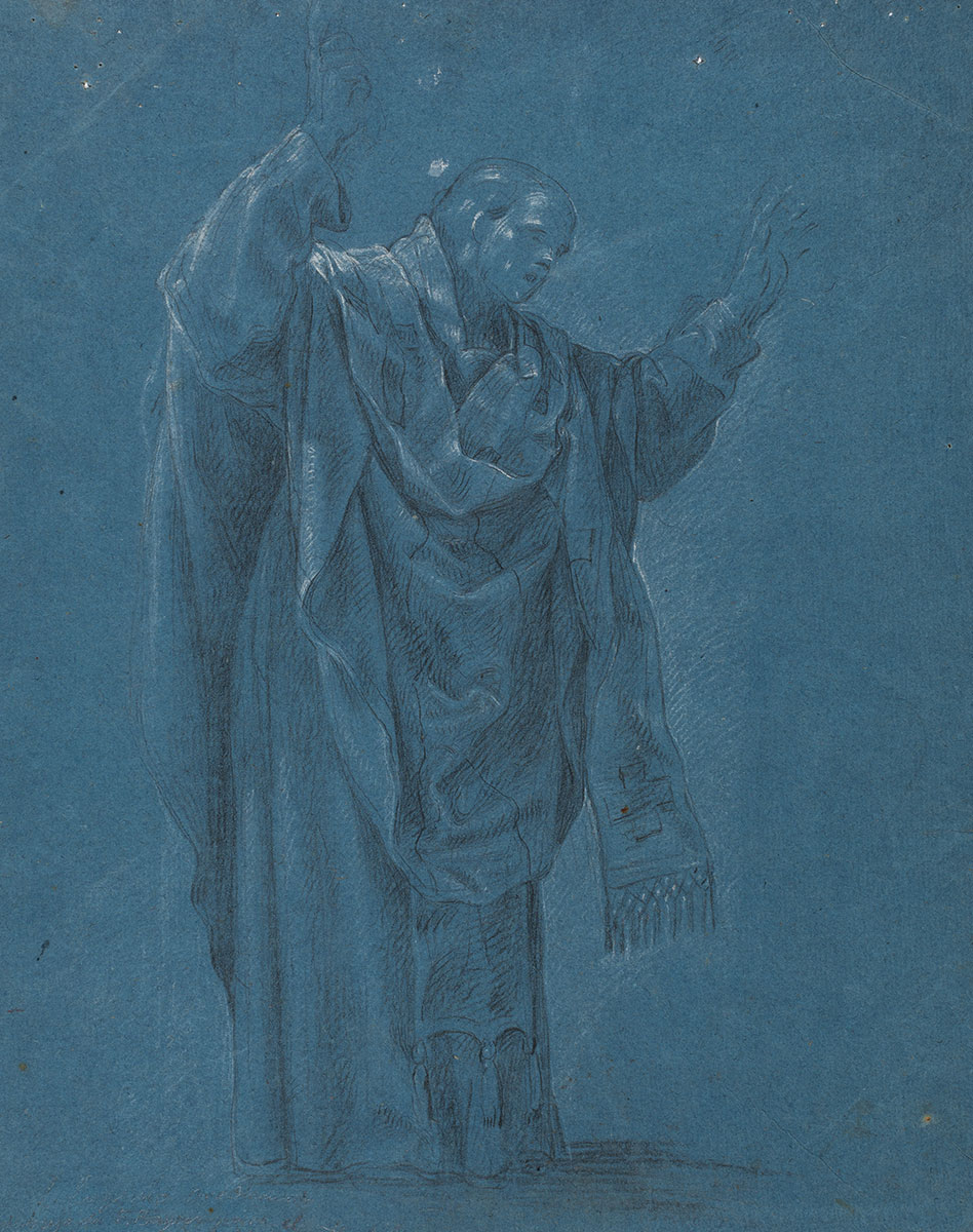 The series of frescoes depicting the life of Saint Eulogius in the cloister of Toledo Cathedral was painted by Francisco Bayeu in the late 18th century. Bayeu, a prominent figure in Spanish Neoclassicism and brother-in-law of Francisco de Goya, was commissioned to decorate the cathedral’s cloister as part of a broader initiative to renew its artistic and religious narrative. The frescoes focus on key episodes in the life of San Eulogio of Córdoba, a 9th-century Christian priest, scholar, and martyr executed in 859 AD for defending his faith under Islamic rule. Bayeu’s compositions highlight scenes such as Eulogius preaching, writing, his trial and imprisonment, and his eventual martyrdom—all rendered with dramatic tension and compositional clarity. Importantly, preparatory drawings (dibujos preparatorios) for these frescoes have survived and provide valuable insight into Bayeu’s creative process. These works on blue paper reveal the artist’s attention to anatomical precision, gesture, and narrative sequencing. They also demonstrate how he carefully worked out the placement of figures and the emotional tone of each scene before executing the final compositions on the walls of the cloister. This drawing is characterized by Bayeu’s refined line work and classical influence, and some are held in institutional collections, such as the Prado Museum, offering scholars a deeper understanding of his methodology and the development of this ambitious project. Executed in fresco secco and designed to harmonize with the Gothic architecture of the cloister, Bayeu’s frescoes reflect both religious devotion and Enlightenment ideals. This cycle not only illustrates the life of a key figure in Spanish Christian history but also stands as a testament to Bayeu’s mastery of large-scale narrative painting in a sacred context.