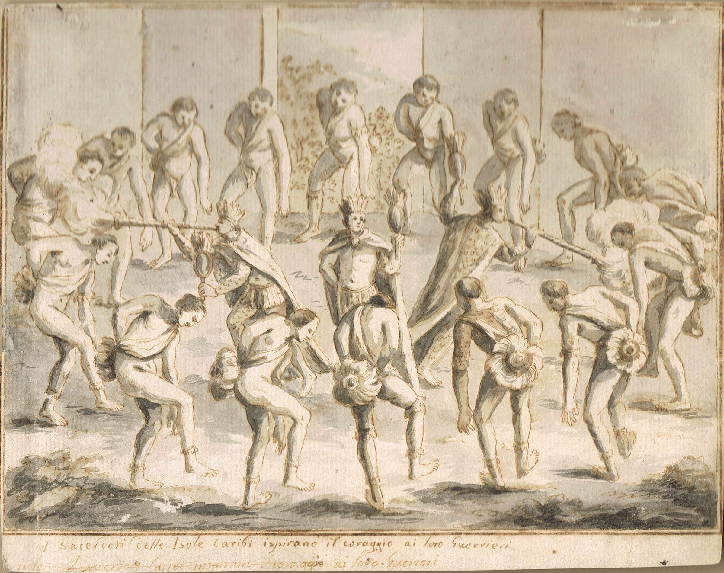 • Inscribed: "I sacerdoti delle Isole Caribi ispirano il coraggio ai loro Guerrieri" (in ink, lower centre)