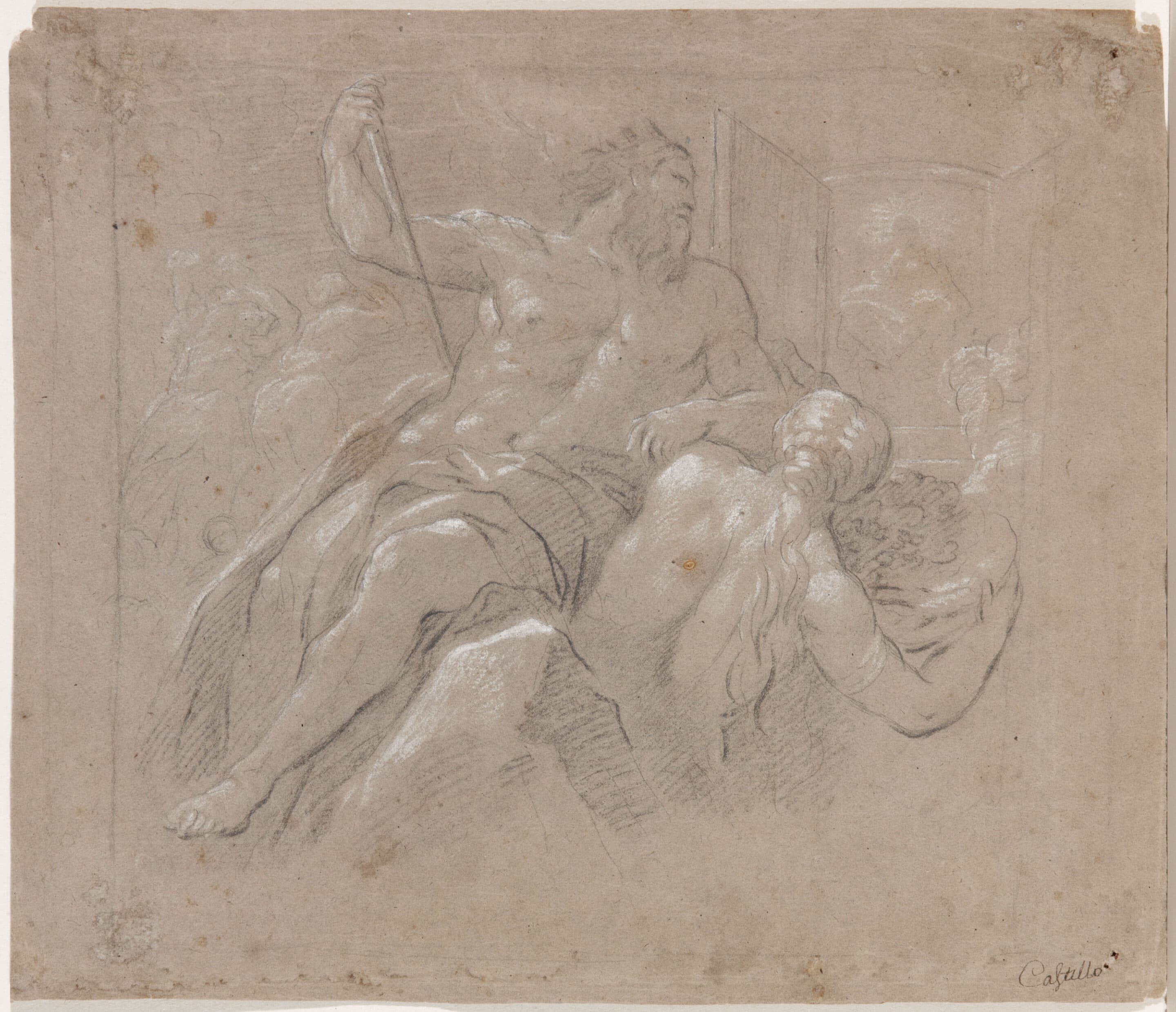The composition of the present drawing, executed in black chalk with touches of white lead, exactly repeats the painting of Deucalion and Pyrrha by Luca Giordano (Patrimonio Nacional, inv. no. 10022576) painted around 1697 for the Chamber of Charles II at the royal palace of Aranjuez. 3 Castillo must have copied it when it was still in the palace, as according to the inventory of the palace undertaken in 1794 in relation to the Will of Charles III, the canvas was hanging at that date in the corridor between the Pieza del Cubierto and the Antechamber. 4 Castillo’s use of designs and models by Giordano is well known. Under the supervision of Corrado Giaquinto he had drawn copies of works by Giordano to be used as tapestry designs for the decoration of the new royal palace in Madrid. 5 In addition, he had worked on the restoration of Giordano’s frescoes in the Casón del Buen Retiro from 1777 onwards. 6 Castillo not only restored the ceiling, but also copied and engraved the series of paintings on the Labours of Hercules (Madrid, Real Academia de Bellas Artes de San Fernando), and the paintings in the building’s vestibule, all now lost.