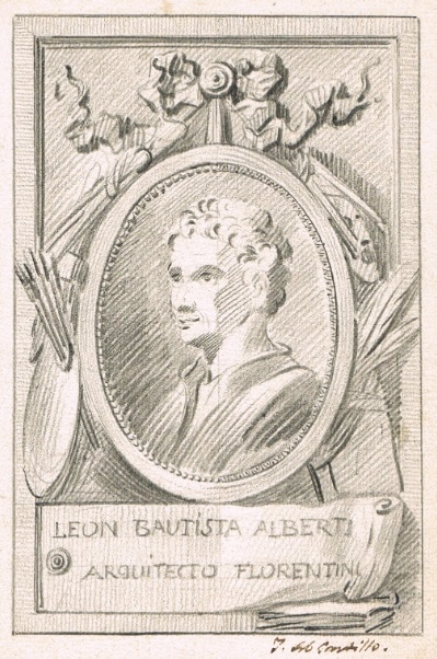 Like the portrait of Leonardo da Vinci, this initial sketch by Castillo of Alberti was a study for the portrait to precede the life of that author by Rafaelle du Fresne.