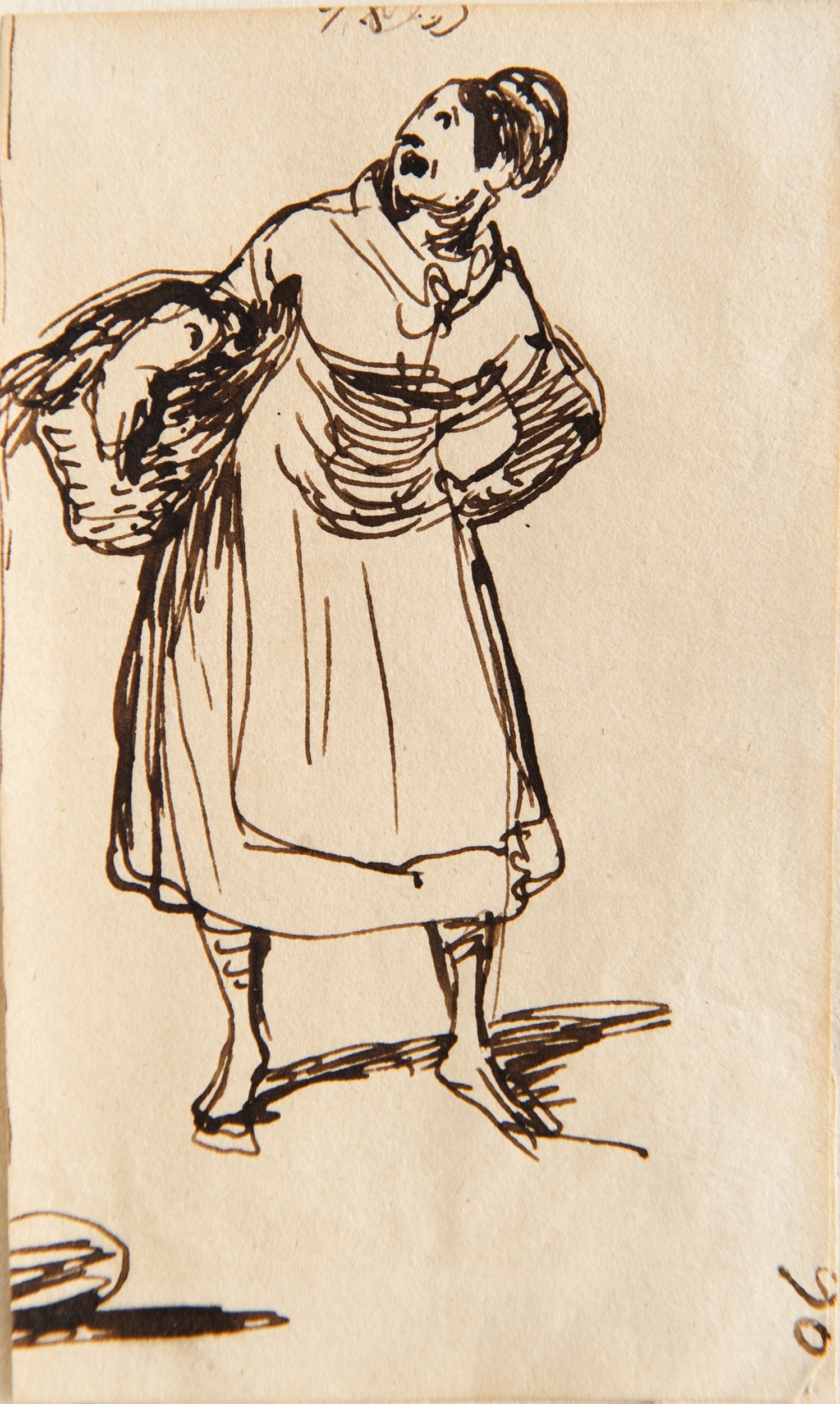 The three drawings presented here depict The Barouche, The Street Seller and A Maja. All are depicted in the same technique of pen and sepia ink on yellowish toned paper. They all reveal Alenza’s typical technical mastery and grace, with lines that convey enormous energy, vitality and expressive force. Particularly striking is the manner in which the artist creates the rapid, zigzagging shadows, which give movement to figures that seem to be alive. In The Barouche, for example, the men seem to be getting into the carriage while the other one holds back the horse. In The Street Seller we seem to hear the woman’s voice as she offers her wares to passers-by, while the Maja makes a dance-like movement in order to initiate a flirtation with a young man located outside the pictorial space.