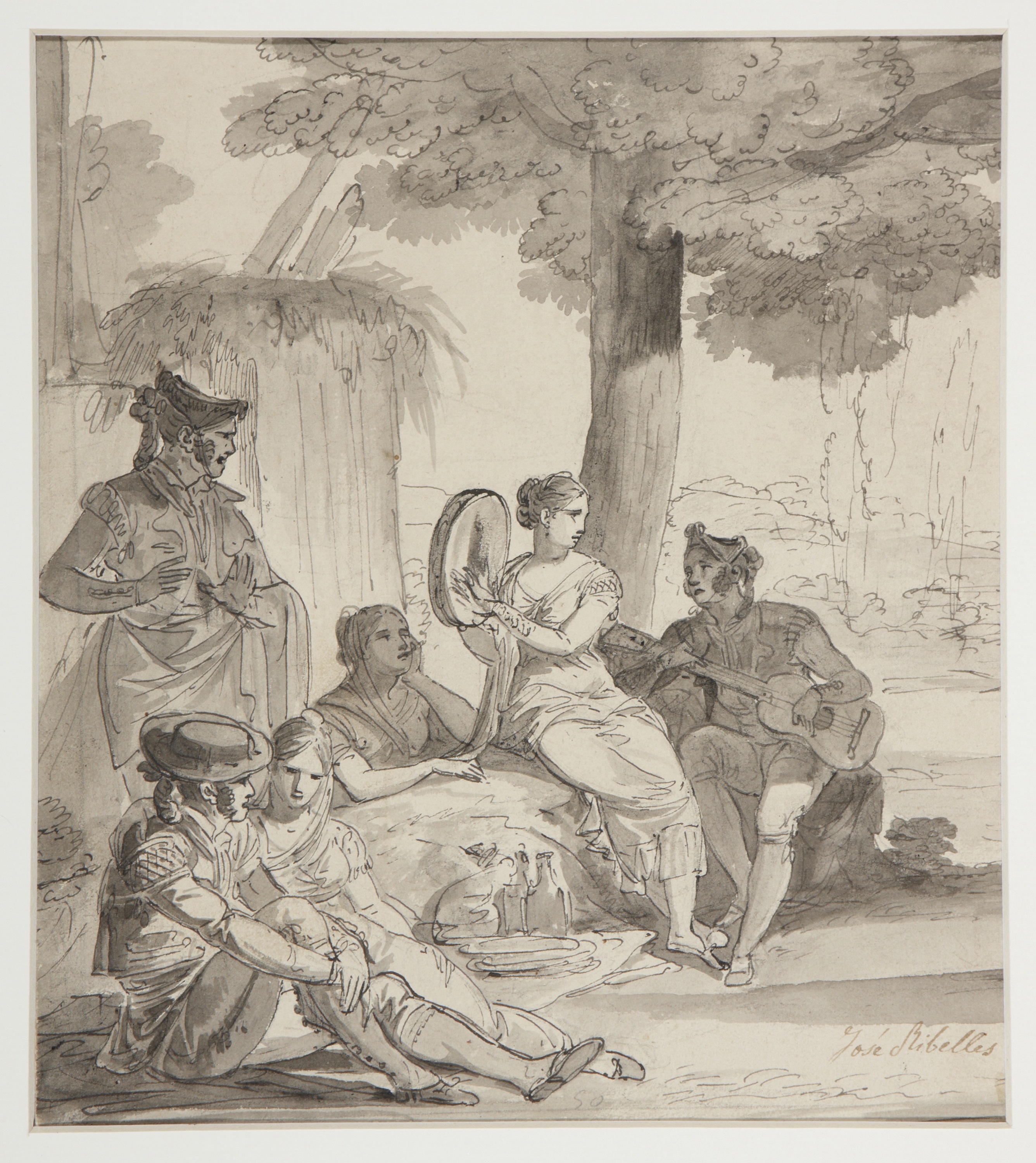 The present drawing depicts various majos in a garden. The composition is set in a leafy landscape and includes a number of figures; and focuses around the woman playing the tambourine. Her figure is emphasised both through its prominent location within the composition and by the white light that envelops it. On her right a majo plays the guitar while on her left a man and a woman enjoy the music and in the lower part of the scene a flirting couple exchange confidences. The drawing is executed in a notably detailed manner through the use of fine pencil lines that create the outlines, to which judiciously applied areas of wash model the light and shadow. Overall, the image is clearly influenced by the genre scenes that José del Castillo, Ramón and Francisco Bayeu and above all Goya painted as cartoons for the tapestries woven by the Royal Santa Barbara Manufactory in Madrid. Ribelles reflects the popular world of galanterie and of majos and majas that Goya so brilliantly depicted in many of his cartoons, including Majo with a Guitar and The Parasol (both Madrid, Prado Museum). However, Ribelles’ figures are imbued with a sense of harmonious classicism and an elegance that makes them seem closer to classical sculptures than to popular figures from contemporary Spanish culture. On the surface, their clothes and appearance bring them closer to the image established by Goya but the overall mood of the work is quite different. Ribelles thus adapted a new and popular subject to his own classicising manner, but in doing so lost the sense of vividness and real life that characterises Goya’s works of this type. The serene, academic classicism of this drawing, which is close to academic studies of classical sculpture, suggests that the composition dates from the late 18th century and thus has little to do with the expressivity and the use of genre detail to be found in the artist’s series of regional costumes, which was one of his last works.