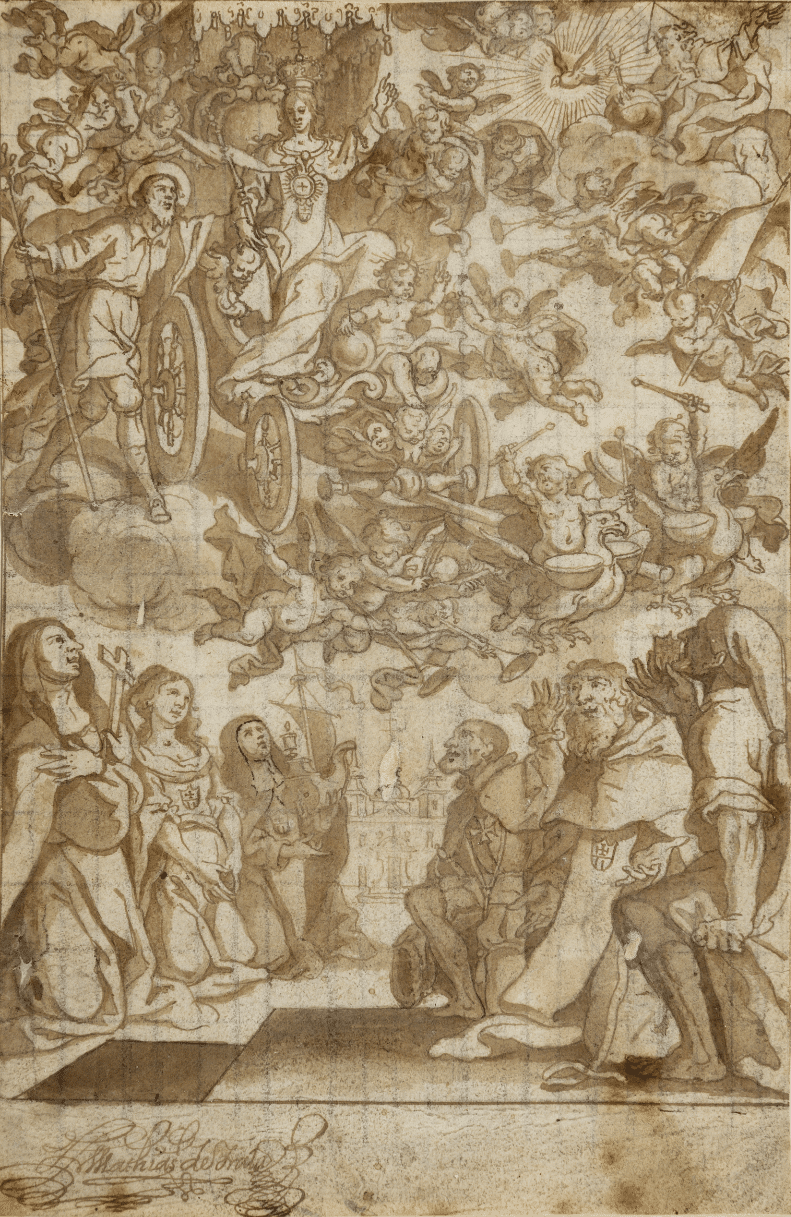 Irala’s style, which was exuberant, decorative, florid and dynamic, is evident in works filled with ornamental details and compositional diagonals and was considered by many to be Rococo. This is clearly evident in the present drawing, which is a paradigmatic one within his output. Its complex and extremely detailed iconography represents the Allegory of the Order of the Blessed Virgin Mary of Mercy, in which the most important saints of the Mercedarian Order are shown praising and venerating the triumphal figure of the Virgin.