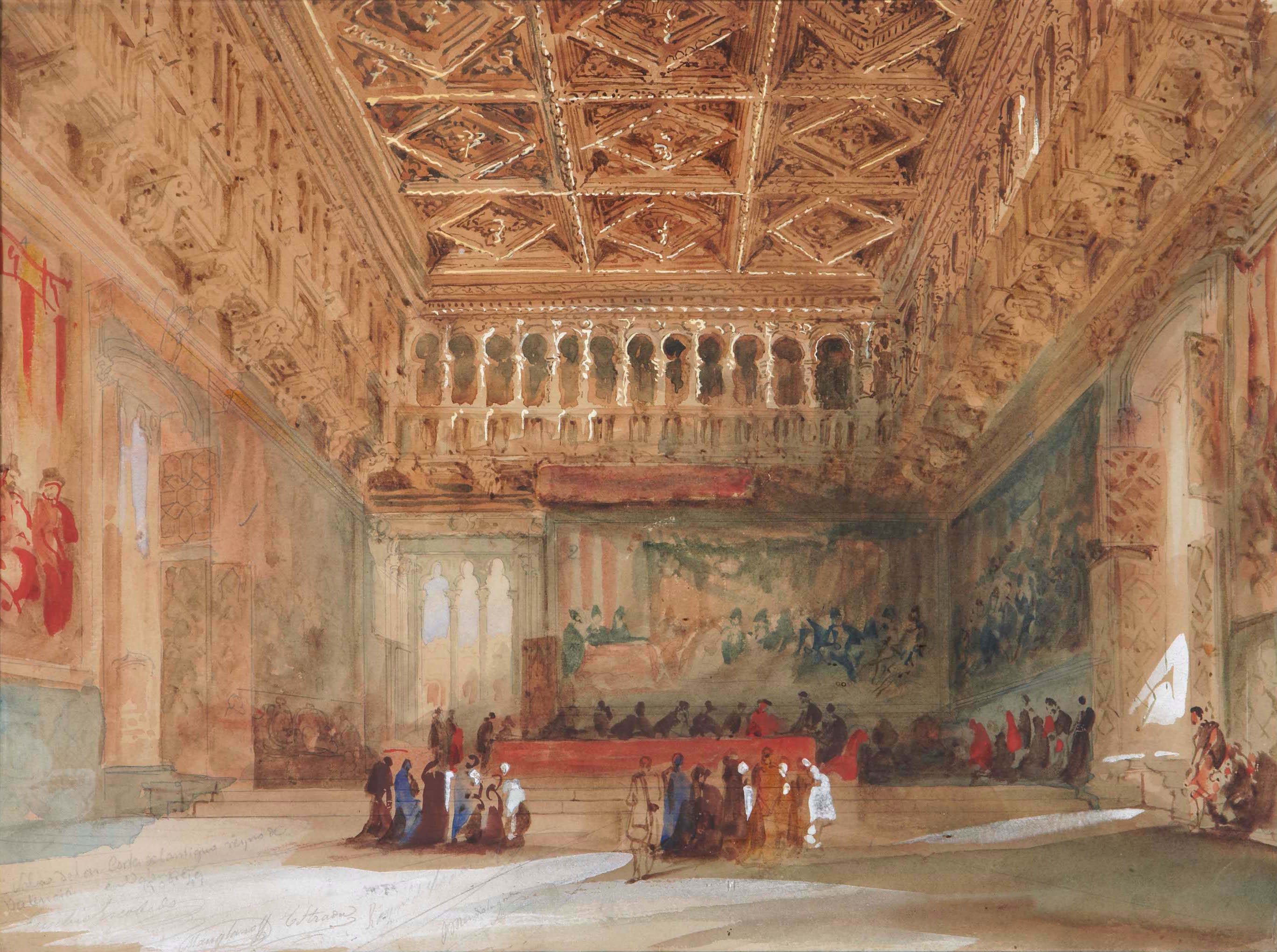 • Inscribed: “Sala de las Cortes del antiguo reyno de/ Valencia/ en Valencia/ 49” (in pencil, lower left)