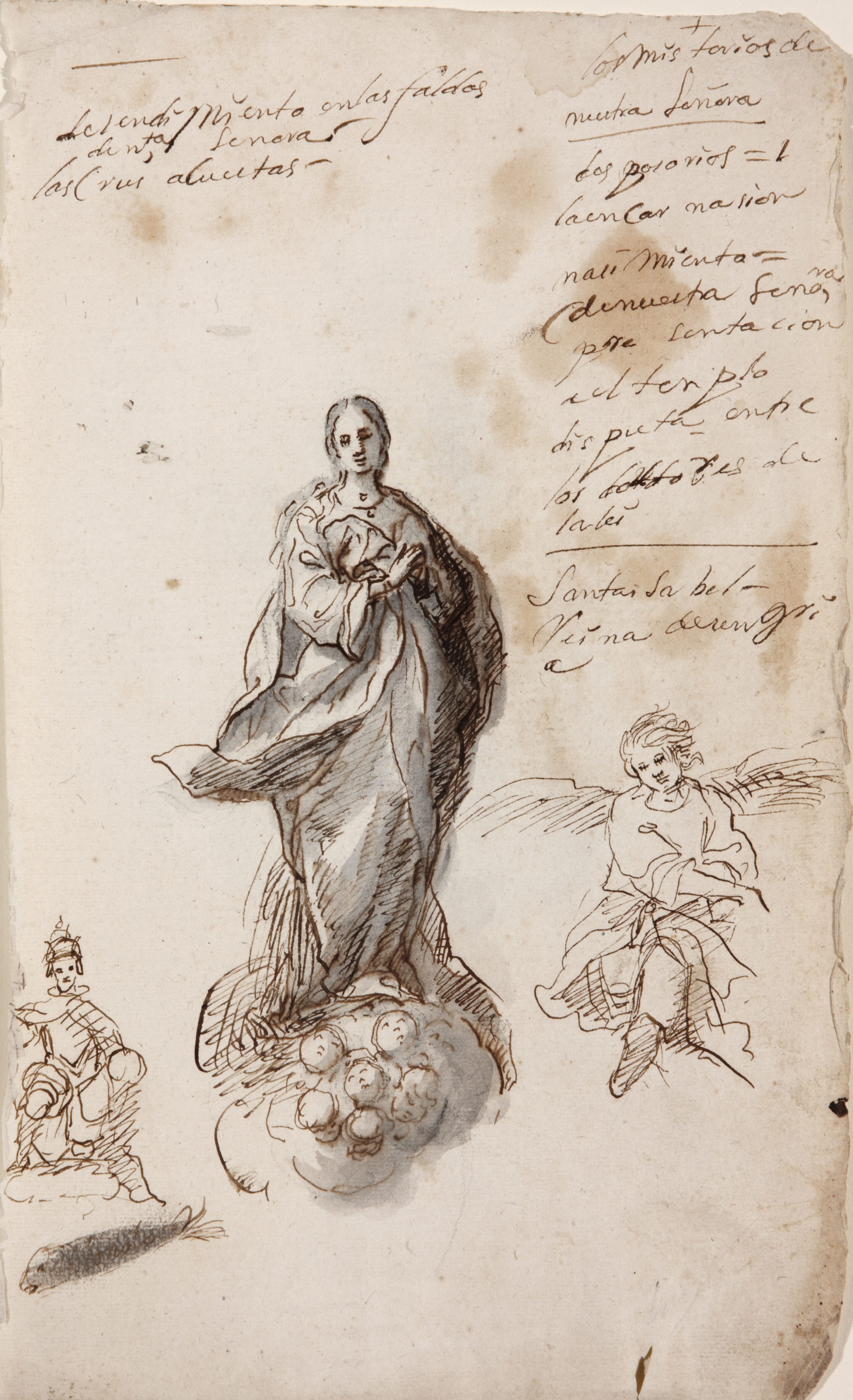 The present drawing is extremely interesting as it allows us to see how the artist approached various different subjects on occasions. It includes three separate sketches for different figures. Firstly, the centre of the sheet is occupied by a highly worked figure of the Immaculate Conception, executed in pen and grey-brown ink with greyish wash. The Virgin’s volumetric figure stands on an orb of clouds and heads of cherubim, her hands joined in prayer and her gaze lowered. The only element that breaks with the solidity of the figure is her billowing mantle. On the left of the principal figure and on a much smaller scale is a half-kneeling efigie regia wearing a crown and holding an orb in his left hand. This figure can be identified as Saint Ferdinand. 2 It is much less finished than that of the Virgin and is rather a rapid, spontaneous sketch executed entirely in grey-brown ink. Finally, to the right of the Immaculate Virgin is an angel with outstretched wings. This motif is also sketchily drawn using rapid, zig-zagging strokes and solely in pen. It is slightly larger in scale than the figure on the left but is smaller than the principal image. Next to the three figures, at the top of the sheet and on the right, are a series of annotations that principally make reference to “los misterios de nuestra Señora” [The mysteries of Our Lady], referring to the episodes from the Marian cycle. The handwriting of these annotations is identical to that found on some autograph letters by the artist which are now in the Archivo Histórico Diocesano in Huelva. 3
