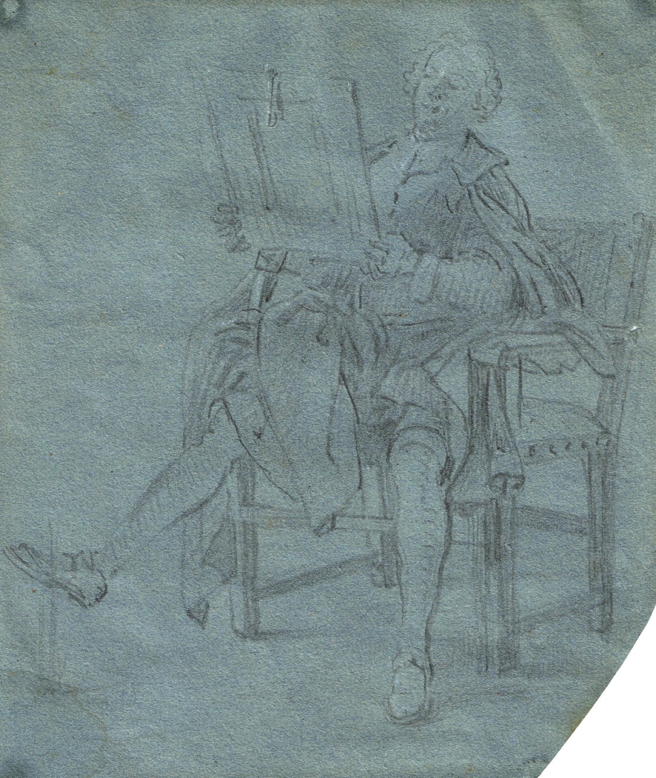 The present drawing depicts a seated figure in an armchair contentedly looking at what seems to be a painting. It is executed on blue paper in oily black chalk with very faint lead white chalk on the face and the frame, thus sharing the characteristics of the artist’s drawings referred to above. In addition, it can be related to one of his small genre paintings as it is a highly finished study for one of the figures in The Barber’s Shop (Patrimonio Nacional, Palacio Real de Madrid, inv. no. 10145134). This figure, to be seen on the right of the composition, is not in fact looking at a painting but rather at his own image in a mirror after having received the attentions of the barber. Another preparatory drawing for this painting exists, depicting A Woman picking up a Pitcher from the Ground (Madrid, BNE, Dib/13/4/85). 6