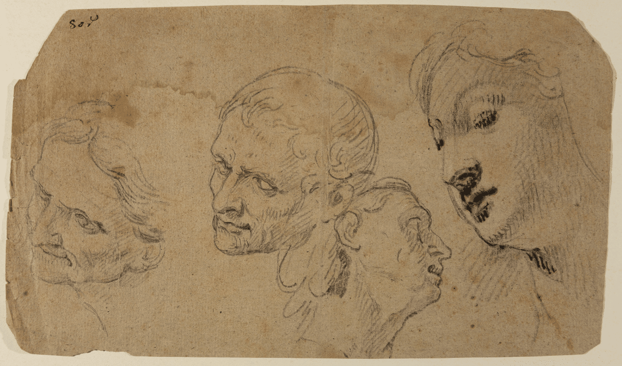The present drawing is a paradigmatic example of the influence of Coello on Ruiz de la Iglesia in the early 1680s. This sheet of sketches of different heads was made in order to carefully study each of the elements in a composition. In this case the heads are those of the figures subsequently painted by the artist in The Holy Family with Saints (fig. 1). From left to right the artist analyses the expressions and faces of Saint Anne, Joachim, Elizabeth and the Virgin. The elderly Anne’s face, Joachim’s rough, weather-beaten one, Elizabeth’s proud expression and the Virgin’s gentle, classical features, once again influenced by Coello, are perfectly depicted through emphatic but minimal black chalk lines. Those used for the hair are undulating, those for the shadows are vertical or cross-hatched, while the outlines of the faces are created with a crisp, sharp technique. Ink is only employed to accentuate some heavily shadowed details, for example the Virgin’s lips. Both the expressivity and the position of the faces in the drawing are almost identical to the final canvas although the liveliness of the drawn line becomes more restrained in the creation of the final oil. There is another surviving study for the painting, for the figures of Saint Elizabeth and the Infant Saint John the Baptist, in the Real Academia de Bellas Artes de San Fernando (fig. 2). 6 Once again it reveals Ruiz de la Iglesia’s meticulous approach to elaborating his compositions.