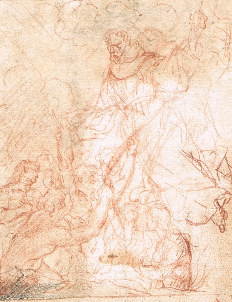 The present drawing may be a preliminary design for one of the large canvases that Cerezo painted for the monastery of Santa Isabel in Madrid. It is particularly striking for its use of a light, rapid stroke of undulating lines with little attention paid to the definition of forms or shadows. 5 Combined with the use cross-shaped, receding perspectival lines, the effect is to create a sense of dynamism that is unusual in altarpieces created in Madrid at this date. Cerezo received the commission to produce three works for Santa Isabel in 1664, namely Saint Thomas of Villanueva giving Alms and Saint Nicholas of Tolentino and the Souls in Purgatory for the altarpieces in the crossing, and a Visitation for the top of the high altar. His compositions were extremely well received and Palomino described them as “truly superb, achieving the highest levels of excellence in art, both in drawing as well as in colour.” 6 The present sheet may be a sketch for the lost painting of Saint Nicholas of Tolentino, of which the appearance and composition is known from old photographs. 7 There are various differences between the final canvas and the drawing. While the figure of Saint Nicholas occupies the upper part of both, in the canvas the saint interacts more actively with the Souls in the lower part by leaning his head more towards them and thus defining one of the compositional diagonals in a more pronounced manner. In addition, while the Souls in Purgatory are devoured by flames in both works, there are a number of differences in their poses and locations. 8 On the reverse of the present sheet is a very rapid sketch in black chalk for one of these figures. With its muscular body, it makes an unusual gesture with its hands clasped to the right in supplication. The same figure but seen from behind appears in the foreground of the final canvas that Cerezo painted for Santa Isabel.