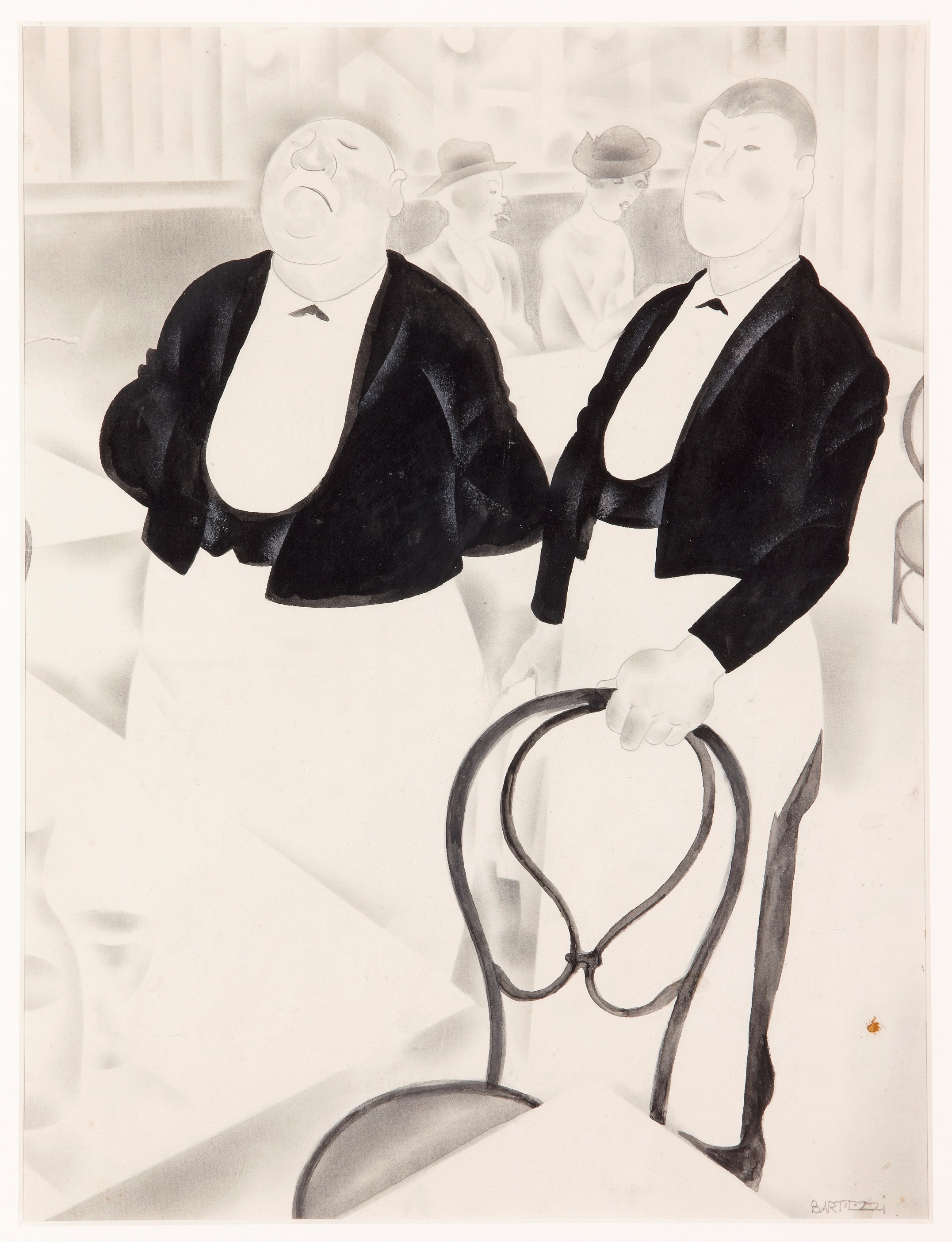 The present Café Scene was included in a monographic exhibition on Bartolozzi held in 2007. 3 The drawing, executed in Indian ink and gouache, uses a witty but extremely expressive line. The white of the paper and the black of the ink create contrasts of light and shade, softened by the greys of the ink wash and the touches of stumping. In the foreground, two neatly dressed waiters are located behind a round table and a chair. Depicted as self-absorbed, they do not look at each other, while their faces have a slightly caricatural feel, evident, for example, in their rounded cheeks and in the plump hand resting on the chair. In the middle-ground is a couple dressed in 1920s style and seated on a divan. The angled perspective used to construct the image leads the viewer’s eye through the scene while expanding the visual field and in fact, the space represented extends beyond the pictorial field as many of the elements are truncated. As a result, nothing in the sketch is finished and the viewer’s imagination is allowed to complete the suggested space. Despite the economy of means, this approach allows Bartolozzi to recreate to perfection the atmosphere of an early 20th-century café. The white marble, circular tables, the chairs with their simple, elegant lines, the divans around the walls and the mirrors hanging above them are all elements that rapidly conjure up places of this type in our imaginations.