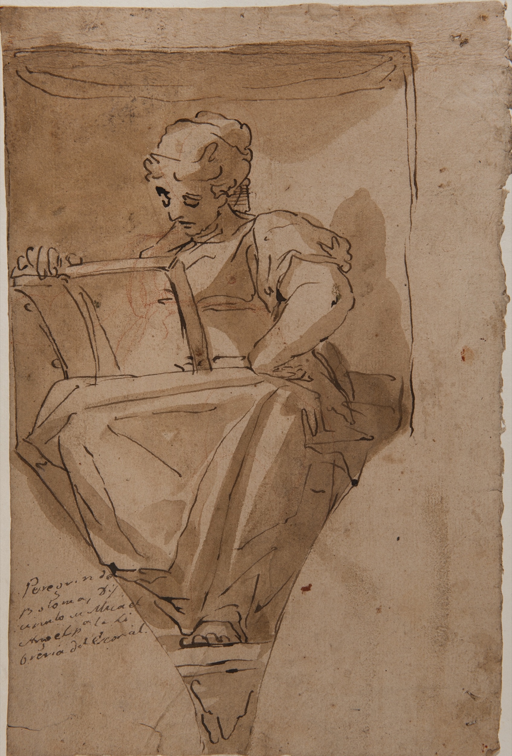With regard to the attribution of this sheet, an inscription at the lower left assigns it to Pellegrino Tibaldi (1527-1596) and also refers to the decoration of the library in the monastery of San Lorenzo de El Escorial. While the handwriting is old, the style of this drawing cannot be associated with Tibaldi. Nonetheless, it can be related to that of another of the other Italian artists who came to Spain during the reign of Philip II, namely Luca Cambiaso (1527-1585). With regard to subject matter, technique and size this drawing is in fact identical to two others that were formerly in the Instituto Jovellanos in Gijón (both destroyed in 1936 during the Spanish Civil War). Pérez Sánchez catalogued them as by Cambiaso, describing them as Allegorical Figures for a Pendentive or Lunette. 1 In addition, there is a third, similar drawing in the Blanton Museum of Art in Austin, Texas. 2