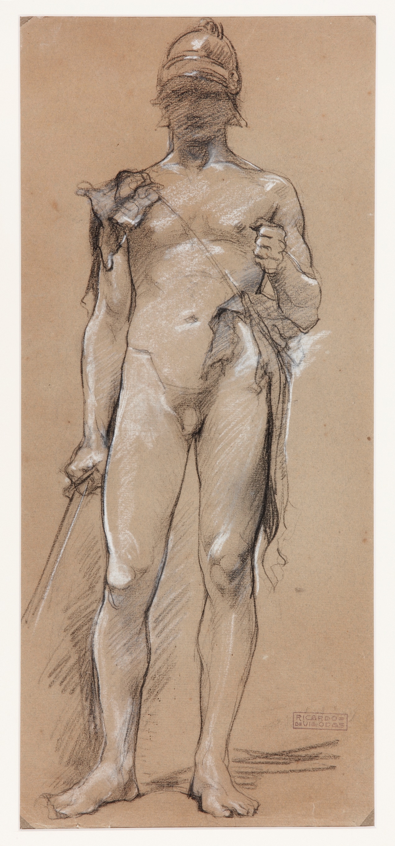 Drawing played a key role in Villodas’ training. The two drawings on the recto and verso of the present sheet correspond to his years of training in which drawing from life, copying classical statues and copying the work of the great masters of the past were traditional activities for students at art academies. Both are executed in charcoal and white lead but are completely different in character. While the figure of the Warrior (verso) conforms to traditional academic practice in its detailed study of light and shadow and of the figure’s anatomy and folds of the drapery, Seated Woman (recto) is executed in an unusually free, deft and modern style. The forms are lightly suggested by the charcoal while the white lead creates the sensation of a heavily folded tunic. With these two drawings Villodas reveals the two facets of late 19th-century art: on the one hand the existence of an academic tradition that continued to esteem strict and rigorous training and which saw the execution of large, historical compositions as the only way for artists to achieve prestige; and on the other, the new modern approach that was manifesting itself through the art movements of the second half of the century, such as Impressionism and Post-impressionism, and which heralded the creative freedom of the early 20th-century avant-garde movements.