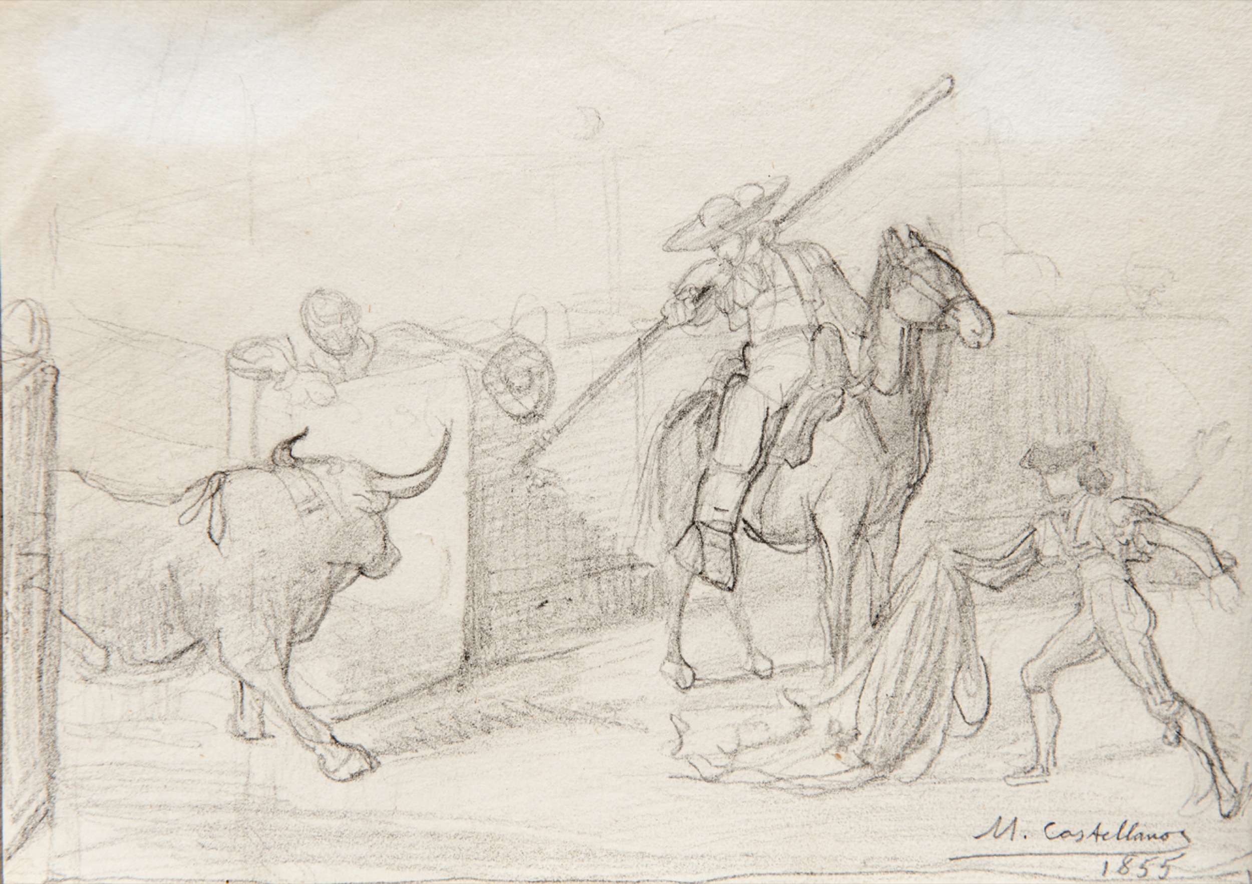 Joy and suffering. Light and shade. Blood and sand. Fiesta and mourning. Life and death come together in the bullfight. All these concepts, which were so closely allied to the Romantic imagination, made the bullfight one of the principal subjects in 19th-century Spanish painting. The plasticity of the movements in that dance in which life itself is at stake meant that many artists turned to the depiction of this spectacle in the form of canvases, prints and drawings. Manuel Blas Rodríguez Castellano was particularly fascinated by the tension, fear, courage and beauty of the world of the bullfight. Better known as Manuel Castellano, he was a lesser but extremely interesting figure both for his role as a “chronicler” of the world of bullfighting and for his collecting interests.