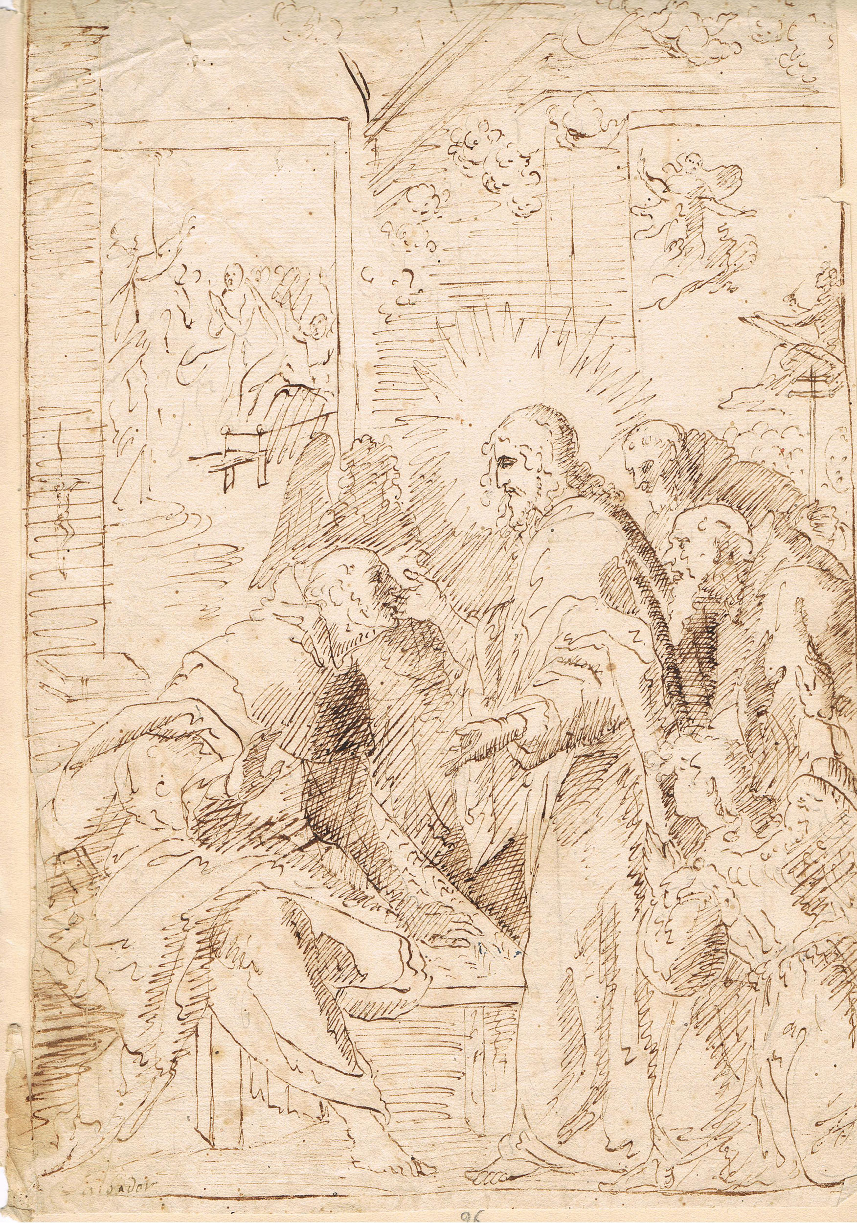 Whether a learning exercise or a revision of Ribalta’s composition, this is probably a youthful creation by Salvador Gómez. Nonetheless, it already reveals his characteristic mesh of strokes created with delicate grey-brown ink and cross-hatched, parallel lines that produce the contrasts of light. 5 This would become the artist’s characteristic and recognisable technique, to be seen in other sketches from his mature period such as The Apparition of the Christ Child to Saint Anthony and The Immaculate Conception, both in the Museo Nacional del Prado (cats. D000191 and D002192).