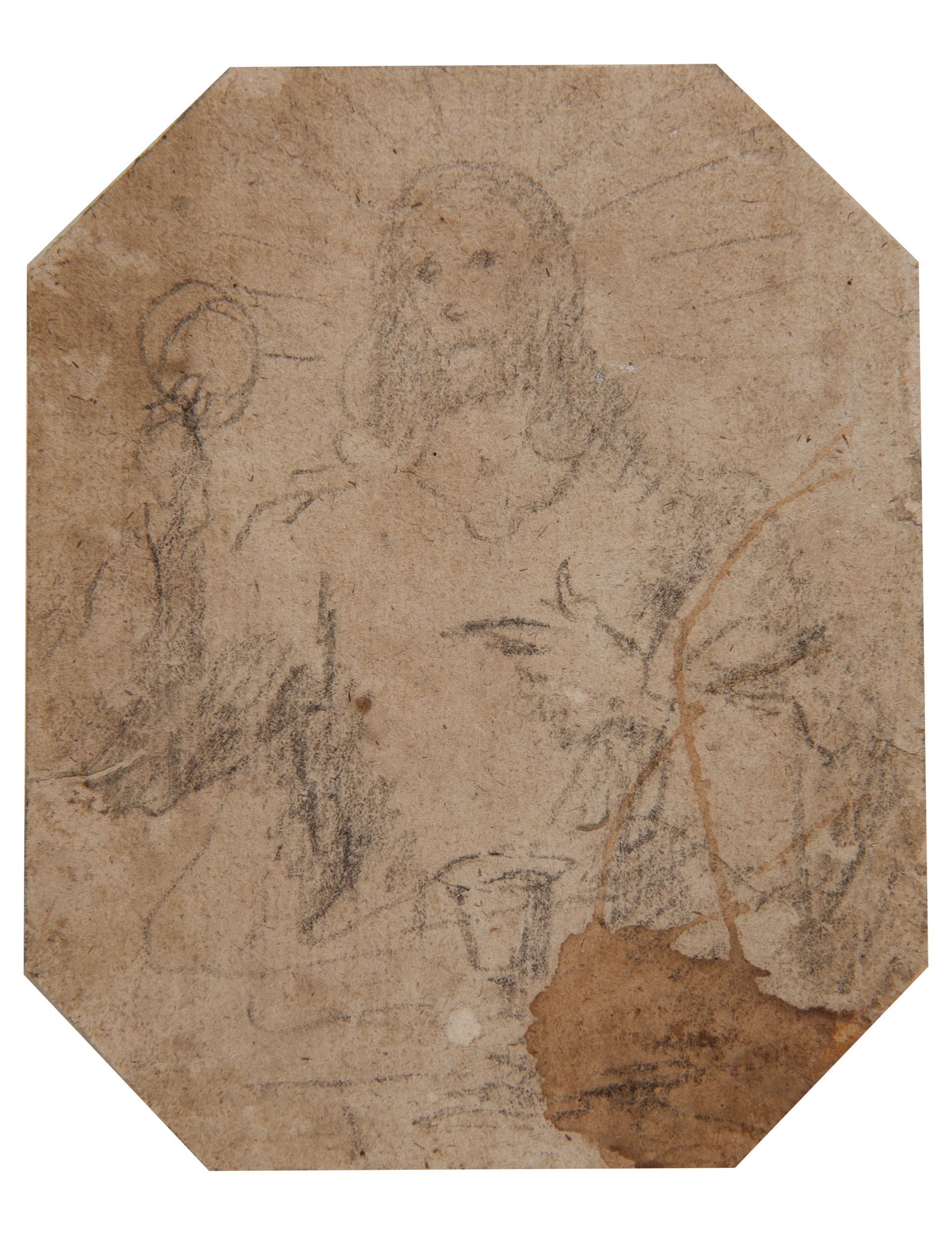 The present drawing should be located within the context of Valencia in the second half of the 16th century. It is a small-scale image, executed in rapid strokes of black chalk, of the Eucharistic Christ, represented half-length. He holds up the Host in his right hand, pointing to it with the other hand. Lightly sketched on the table is a chalice. The image is an exact reproduction of models by Juan de Juanes, the preeminent figure in Valencian painting from 1550 onwards. Among his most celebrated images are those of the Eucharistic Christ, derived from the painting by his father for Valencia cathedral around 1525, which would become widely disseminated through popular devotion. The earliest known version of this subject by Juan de Juanes and hence his first depiction of this subject (c. 1545-1550), was painted for the high altar of the church in Fuente la Higuera (Valencia) and is now in the Museo del Prado (inv. no. P-844). 2 The artist used this composition as the basis for one of his most celebrated works, The Last Supper (Museo del Prado, inv. no. P-846), painted around 1562 for the lower level of the altarpiece in the church of San Esteban (Valencia), and for the Eucharistic Christ in Valencia’s cathedral.
