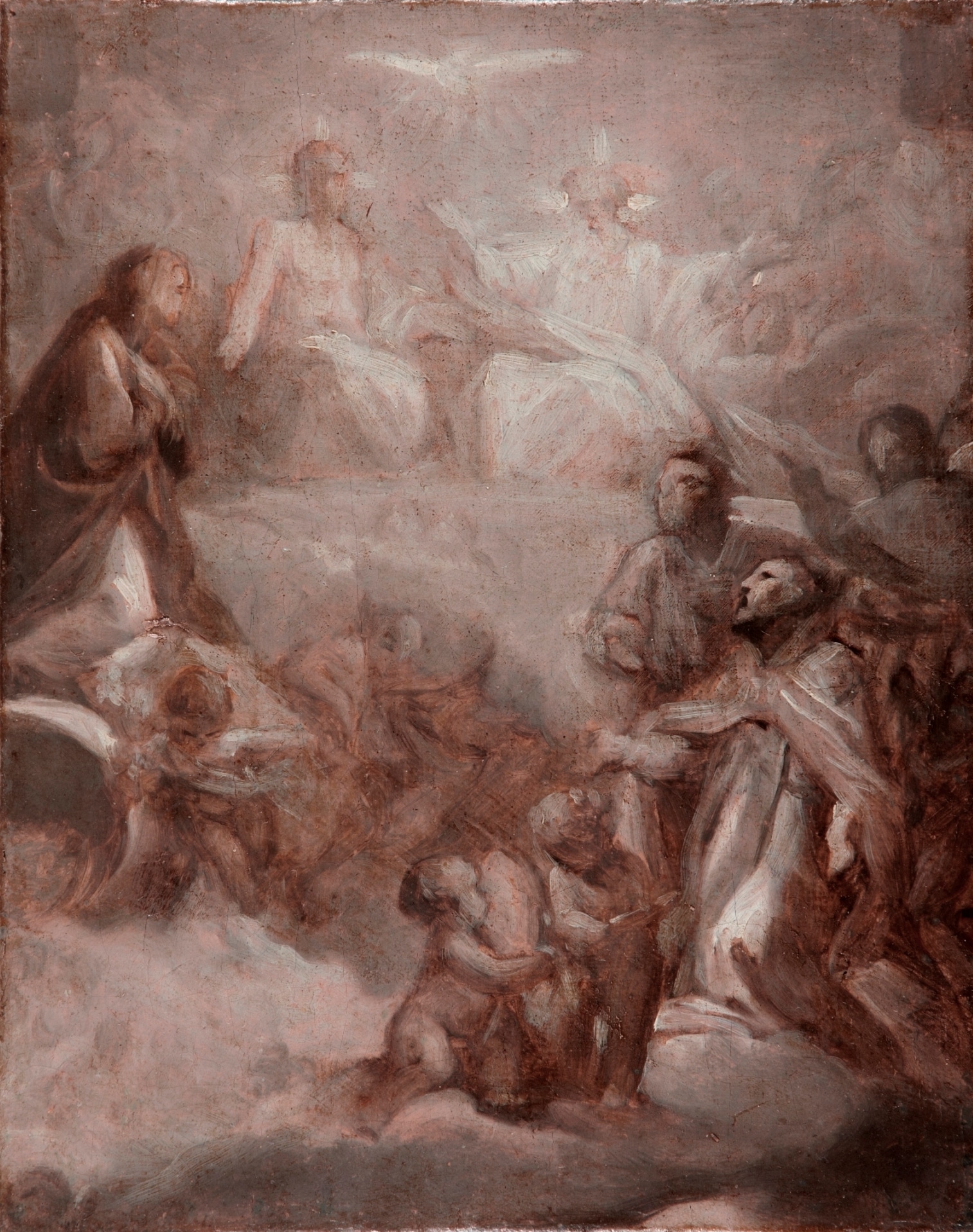 The present work is a preliminary study for the large painting executed for the collegiate church of San Isidro and largely corresponds to the design of the final painting. It is organised over three levels. In the upper part, seated on a throne of clouds and within a heavenly space, are God the Father on the right, Christ on the left and the Dove of the Holy Spirit between them. On the left, on an intermediate level is the Virgin Mary, alone slightly raised up to make her stand out and to place her closer to God. On the right on this level are three Spanish saints: Damasus, kneeling, Lawrence, immediately behind him, and Saint James the Apostle in the background. Finally, towards the bottom of the composition, in the third level, are two small boys with the pontifical symbols of the triple papal tiara and the keys of Saint Peter, supreme head of the Catholic Church. The intention of the painting, installed at the top of the high altar of Saint Isidro, was thus to symbolise the commendation and protection enjoyed by the patron saint of Madrid from the papacy, the leading Spanish saints, the Virgin Mary and the Holy Trinity.