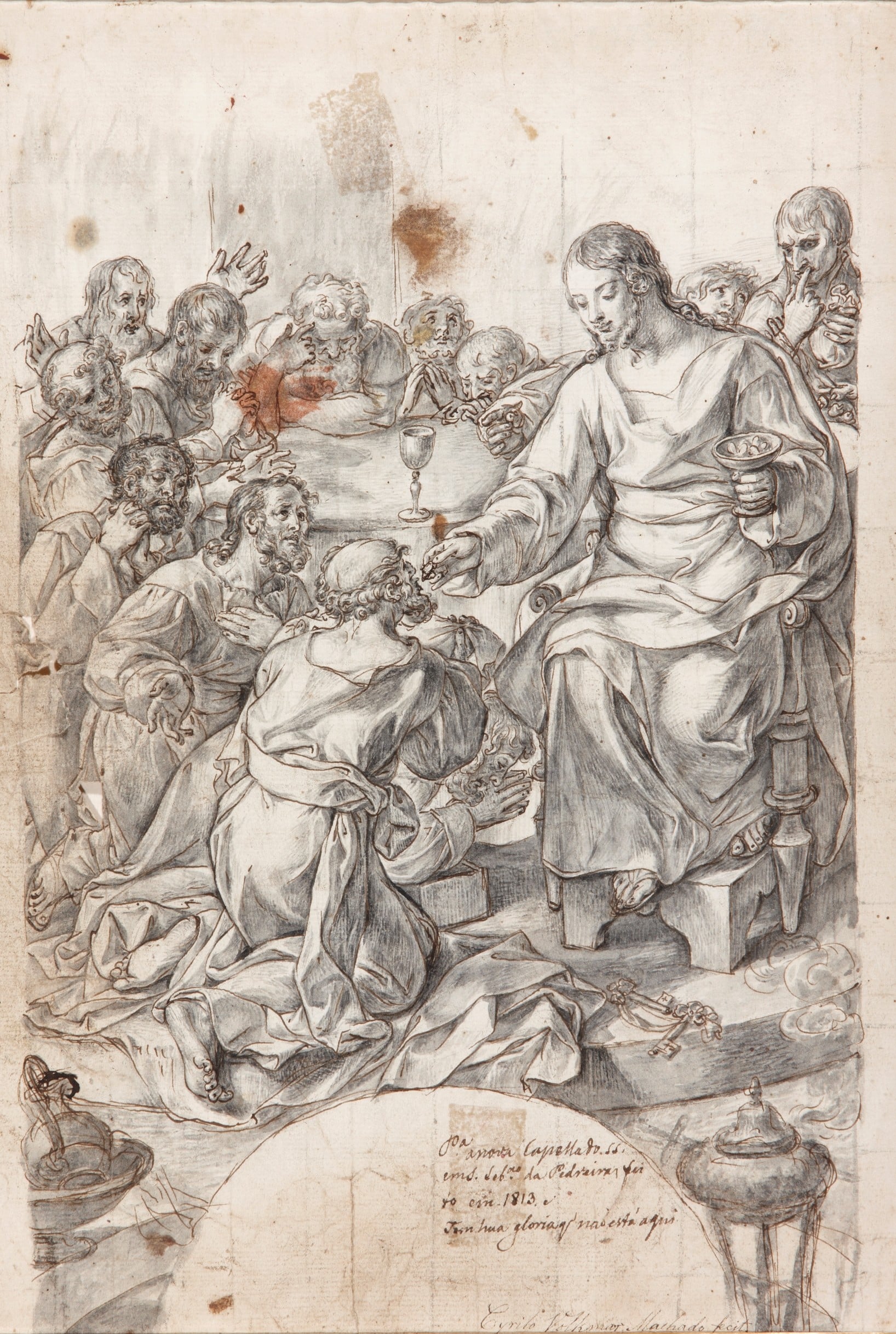 The first preparatory study (MNAA, inv. no. 1960) is dated 1812 and includes the principal features of the final composition. The Apostles are grouped around a circular table in a monumental architectural setting. Christ is standing in the right corner administering communion to one of his followers. The figure of Christ is also the principal motif in the second drawing for this project, executed in 1813. The composition has now been completely altered and Christ is seated, administering communion to Saint Peter (MNAA, inv. no. 1761). The present sheet is the last study by Volkmar Machado for the altarpiece and the one that functioned as the model for the finished oil on canvas. It combines elements from the two previous drawings, but is far more detailed and highly finished. Christ is seated on a raised, throne-like chair at the centre right, with the twelve Apostles grouped around him at a circular table. The Apostles reveal a wide range of physical types and poses. Towards the lower part of the composition is an empty semicircle indicating the location of the ciborium. On one side of this semicircle are the ewer and basin used for washing the Disciples’ feet in the ritual that Christ established prior to Communion. Finally, in the lower right corner is an incense burner symbolising the death of Christ and hence his sacrifice for the salvation of mankind. The drawing is an exact model for the final composition painted for the church of Sao Sebastião aside from two details: the absence of the glory of angels in the upper part, which is not included here, as the artist notes in the inscription; and the architectural structure on the left side, the addition of which makes the final painting heavier and less clear than the drawing. The painting was completed in 1814 and is dated and signed “1814 CVM”.