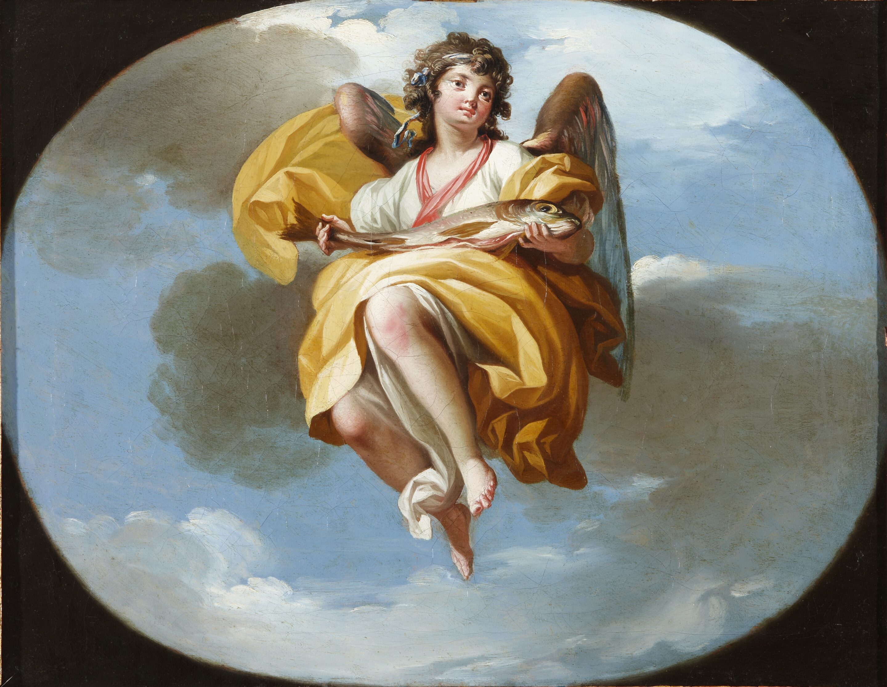 In the mid-17th century, a small oratory dedicated to Jacobo Gratij, Knight of the Order of Christ and Apostolic Nuncio of Pope Gregory XIII to the court of Philip II of Spain, was erected in the center of Madrid, according to the measurements of Juan de Torija, the first surveyor of royal works. Nuncio Jacobo Gratij had settled in Madrid, been ordained a priest, and bequeathed his fortune to the foundation of the Royal, Ancient and Venerable Congregation of the Unworthy Slaves of the Most Blessed Sacrament, whose mission was to spread Eucharistic worship. A century later, the building, known as the Royal Oratory of the Knight of Grace, no longer met the needs of the Congregation. Its reconstruction was decided during the reign of Charles III and work began in 1782, under the direction of Juan de Villanueva, the first architect of royal works. Villanueva, who was commissioned for the first time on a religious project, himself recommended that the tempera paintings on the dome be entrusted to the painter Zacarías González Velázquez, then the most renowned painter at court. Zacarías had trained with Mariano Salvador Maella, his brother-in-law, before entering the Academy of Fine Arts of San Fernando in Madrid in 1777. His father, Antonio González Velázquez, also a painter, was its director. After his years of apprenticeship, he was appointed Academician of San Fernando in 1790, an institution he then directed from 1828 to 1831. The artist worked for the court, executing frescoes for various royal sites such as the Pardo Palace and the Casa del Labrador residence in Aranjuez. At the same time, he received commissions for religious works throughout the country. He thus produced works for the oratory of the Santa Grotto in Cadiz (with Goya), the cathedral of Toledo, the cloister of the Basilica of San Francisco el Grande in Madrid, the tabernacle of the cathedral of Jaén, as well as several canvases and mural decorations for the Royal Oratory of the Knight of Grace in Madrid, the work to which we refer here. For the latter, and in accordance with the available documentation, Zacarías had received instructions directly from the Congregation regarding the themes to be executed that would adorn the half-orange vault, the skylight and the pendentives. To decorate the triangular spaces of the four pendentives, it was agreed that the figures of “Saint Michael, Saint Gabriel, Saint Raphael and the Holy Guardian Angel” would be painted. Before work on the dome began (we know that it had already begun on March 28, 1792), Zacarías González Velázquez probably had to submit sketches of the paintings he was going to make to the Congregation for approval. Some of these oil on canvas sketches are preserved, such as those depicting the Old Testament passages that mention the sacrament of the Eucharist, preserved in the Peralada Castle Museum in Catalonia. Also preserved are the four pendants, works that we present here, which remained in the possession of their author until his death in 1834, as evidenced by the inventory of the assets of his testamentary succession. The document in question states: “145. Four sketches of the four Archangels that appear on the pendentives of the church of the Knight of Grace, one foot and six inches long and one foot and three inches high, with a value of four hundred reales… 400. The works were awarded to his daughter Clara González Velázquez, as indicated in the document certifying her share of the inheritance. The four canvases depict, within oval shapes, the flying figures of the Archangels and the Guardian Angel, each with an attribute that helps identify them. Thus, Saint Michael is depicted crushing a serpent that symbolizes Evil. Saint Gabriel holds lilies in his hands and points towards the dove of the Holy Spirit, two emblems of the Annunciation. Saint Raphael holds a fish. As for the Guardian Angel, he carries a child in his arms, whom he protects. The colours, elegance, and movement of the figures make these works among the best of Zacarías González Velázquez’s production and references in Spanish neoclassical painting. They are all the more important since the tempera paintings made by the artist on the pendentives of the oratory have not been preserved. Severely damaged by humidity, they were chipped away down to the mortar layer during the restoration work on the building that took place between 1975 and 1979 and were irretrievably lost. Following this, they were replaced with a decoration that included garland motifs and the Congregation’s coat of arms, and then restored, like the rest of the dome, in 2002. However, after locating the sketches that we present here, and also thanks to old photographs, it was decided in 2010 to recreate the original paintings on canvas and place them on the pendentives. The artist’s sketches have once again contributed to shedding light on a part of the history of the Oratory of the Knight of Grace, one of the great jewels of Madrid’s neoclassicism, which has also been able to regain its original appearance.
